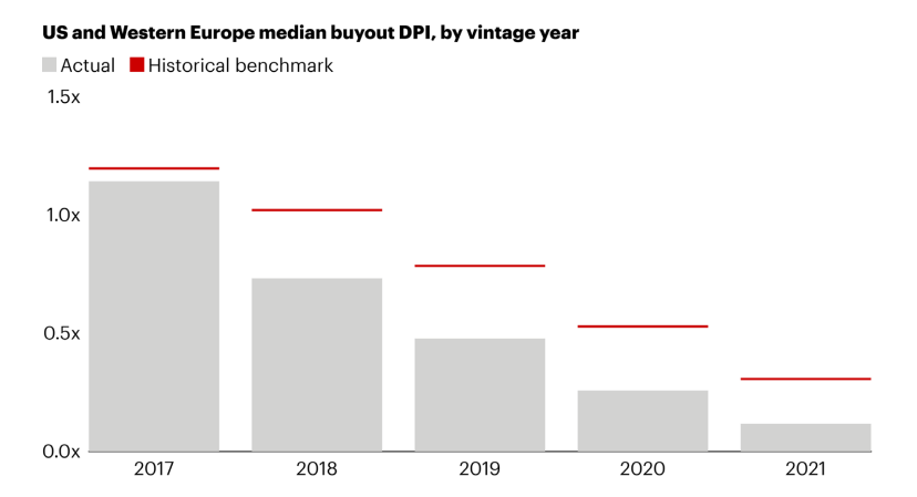 The root problem can be seen in DPI for recent fund vintages.