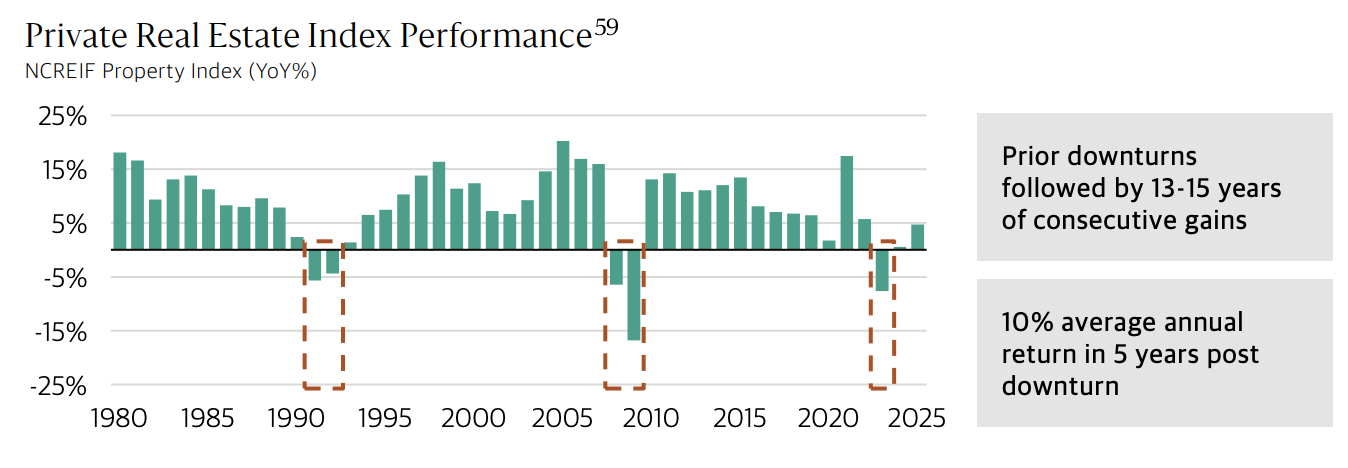 In the prior two downturns private real estate delivered double -digit average annual returns over the following five years as fundamentals and capital markets recovered.