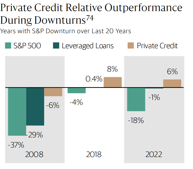 Over the past twenty years, the S&P 500 posted negative annual returns three times; in each of those periods, private credit significantly outperformed equities and leveraged loans, twice delivering positive absolute results