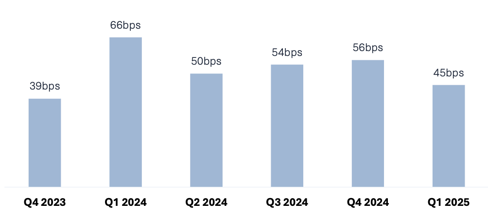 When rates peaked at ~5% above pre-2022 levels, a loan underwritten at 5.5x EBITDA would have faced an additional 25-30 cents in interest payments for every $1 of EBITDA at underwriting.