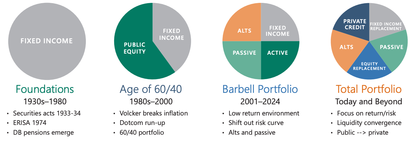The goal of most institutional investors has not changed in decades: 7-8% total return (or 5-6% real return). What has changed is the starting point—the risk-free rate—which sets the foundation. Looking back through history, there have been four major phases of institutional investor asset allocation.