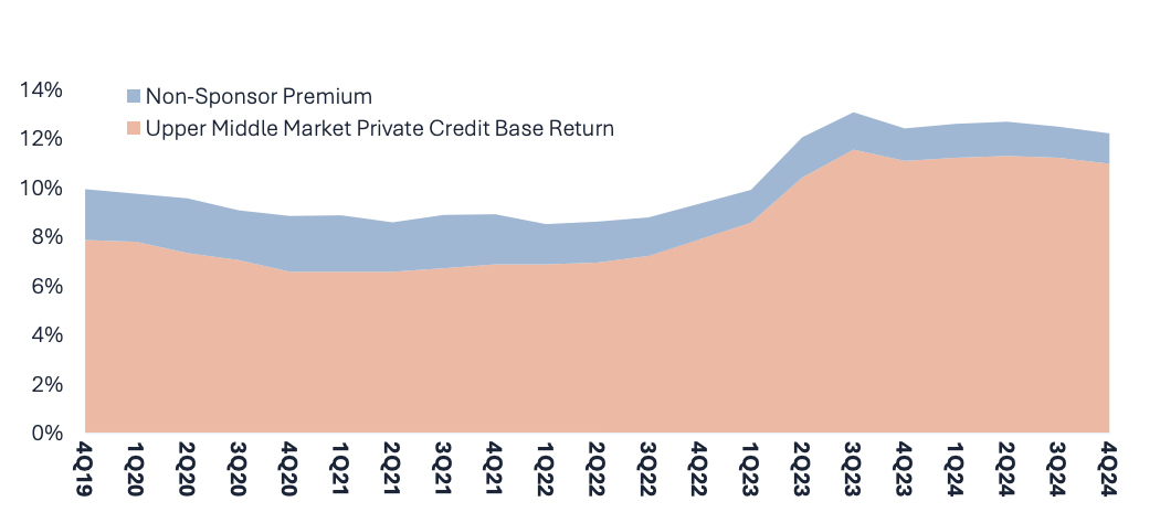 Spread premium driven by (a) difficulty originating non-sponsor deals and (b) increased diligence effort given the inability to rely on a sponsor’s diligence.