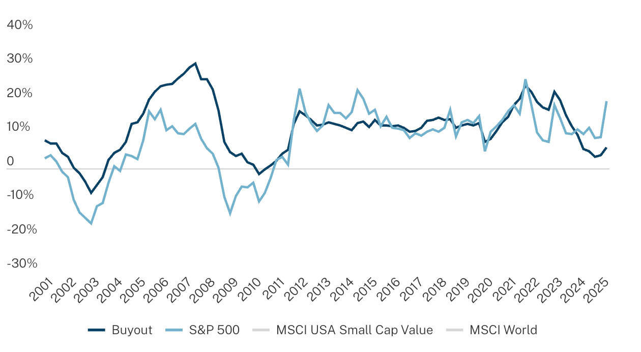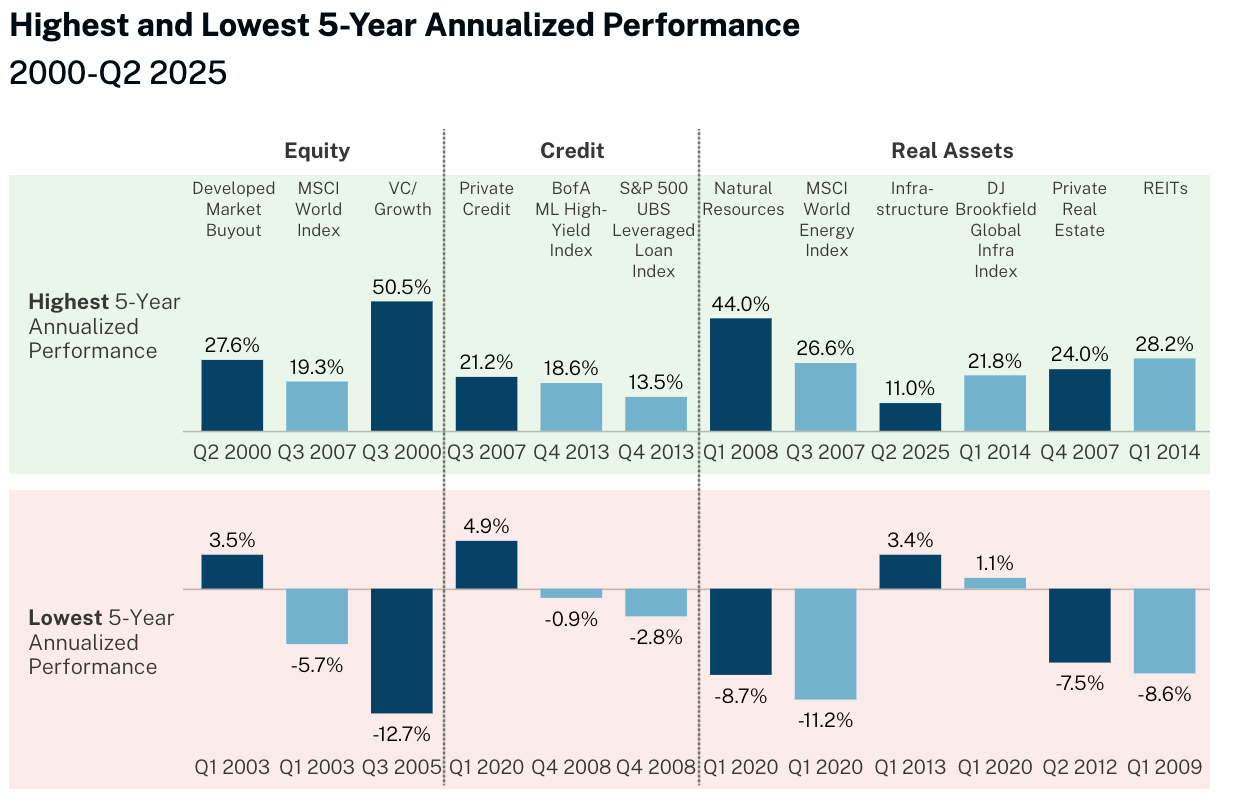 Maybe this is the most important chart in this update. We know that there is a great deal of attention paid to the risk of private markets. If risk is defined as risk of loss, it’s overstated. You really have to work hard, and incompetently, to lose money in private buyouts, credit and infrastructure. That’s a nice cushion to have. Plus, if that wasn’t enough, you aren’t giving up any upside. Your best periods in buyout and credit are better than what you get in the public markets.