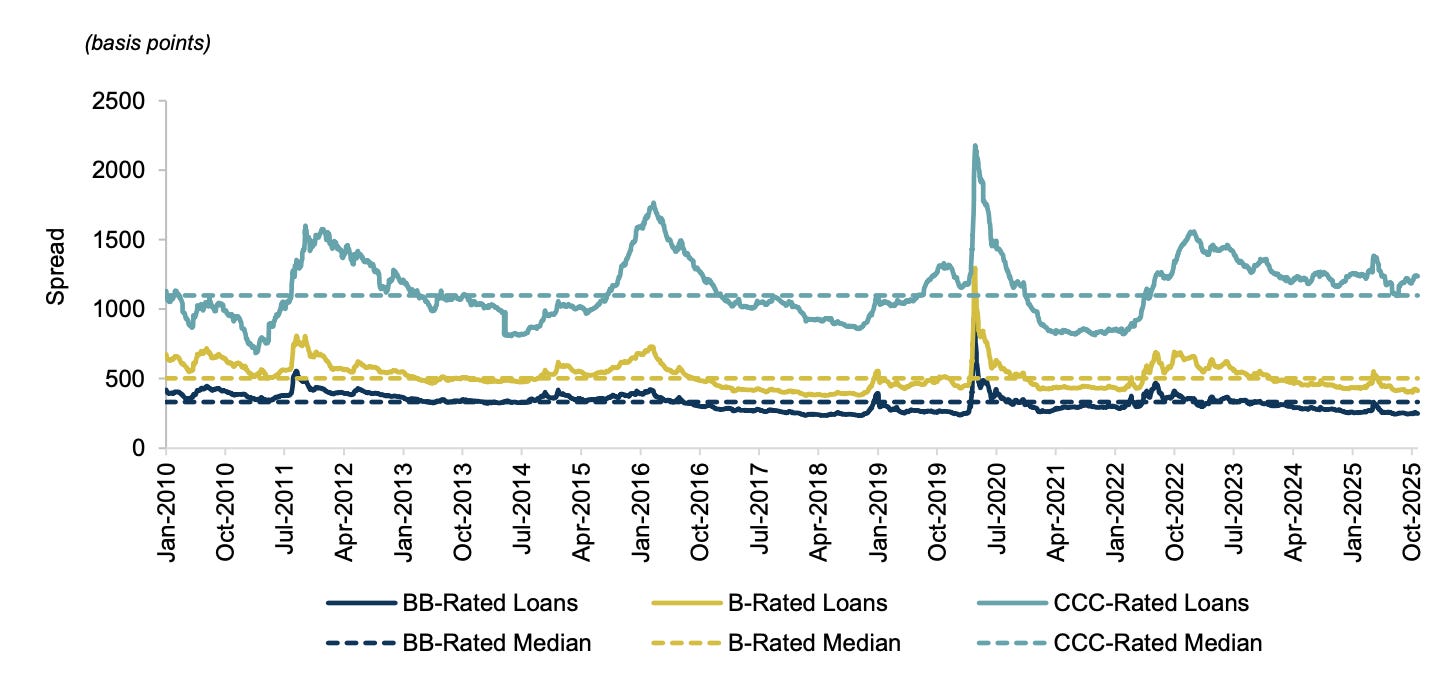 CCC-rated loans are trading outside their historical average, with an average spread in excess of 1,200 bps.