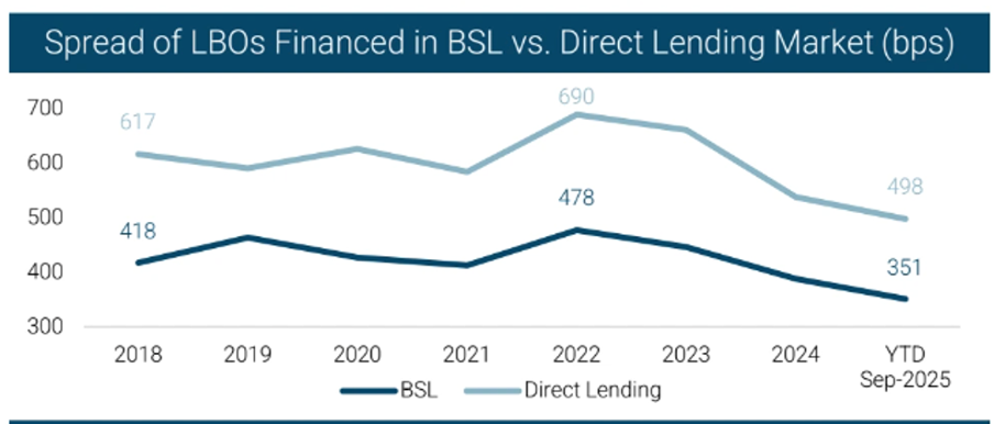 Despite this, private credit still has a 125 to 150bps premium to BSL.