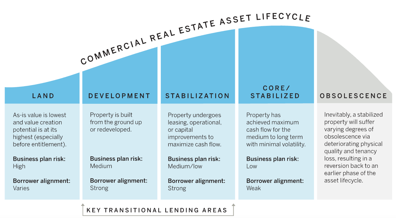 Transitional CRE lenders typically provide senior secured loans to CRE for the purposes of upgrading, leasing, and/or reprogramming.