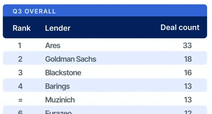 9fin published its European private credit deal rankings for Q3 25. Ares tops the tables with nearly double the number of deals of its nearest