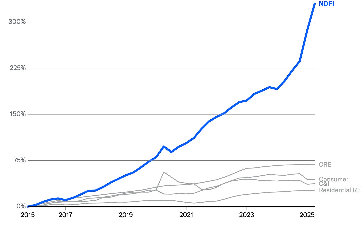 It highlights that NDFIs are driving loan growth at US banks outpacing all other bank lending activities since 2016