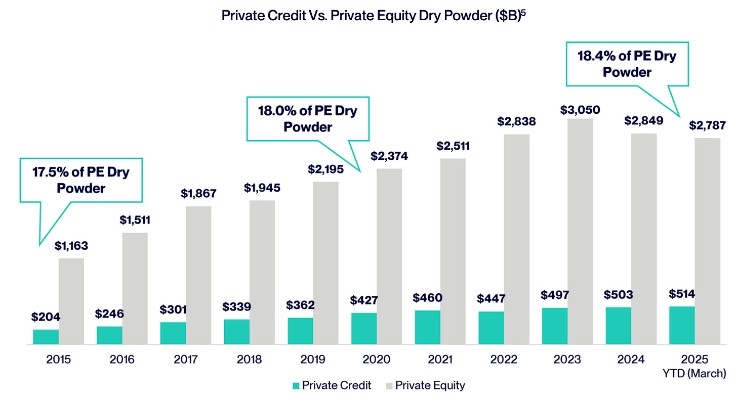 Private credit dry powder relative to private equity dry powder has remained almost unchanged over the last ten years