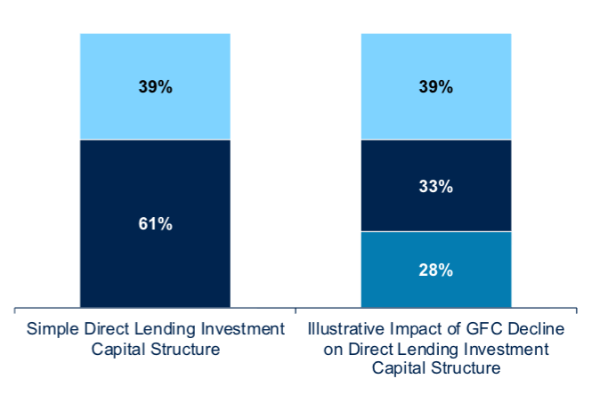 Blue Owl highlights that its loans are generally senior with a weighted average loan-to-value of 39%.