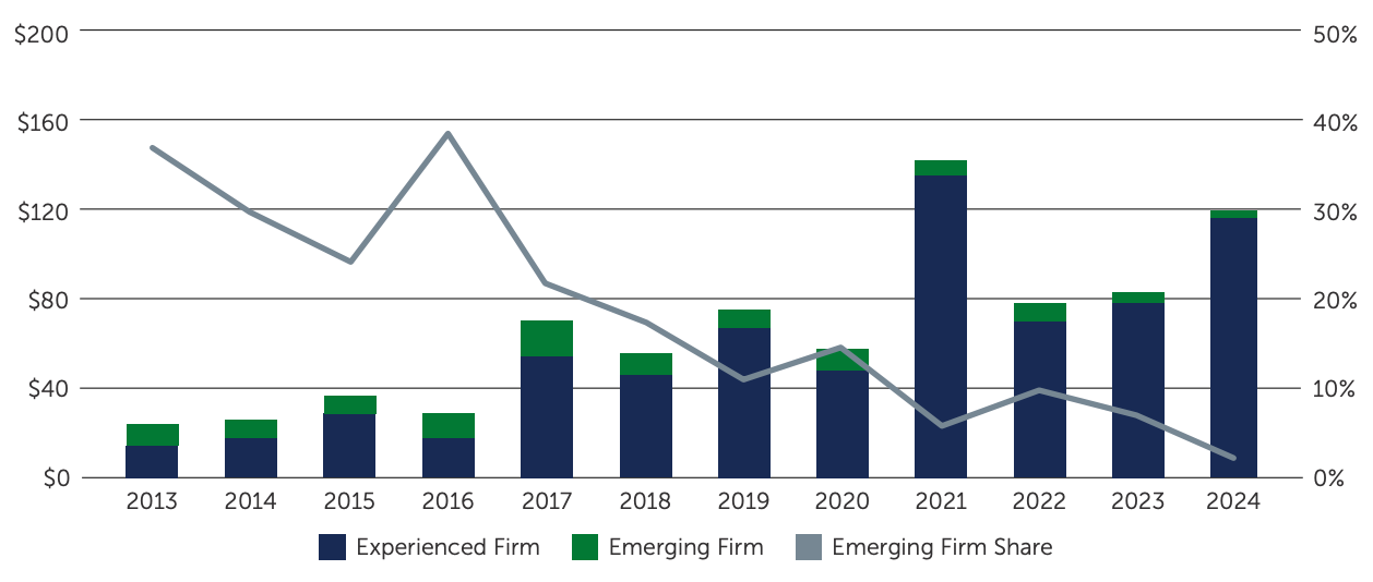 Fundraising data shows a similar trend, with new entrants accounting for just 2% of the total fundraising share in 2024.4