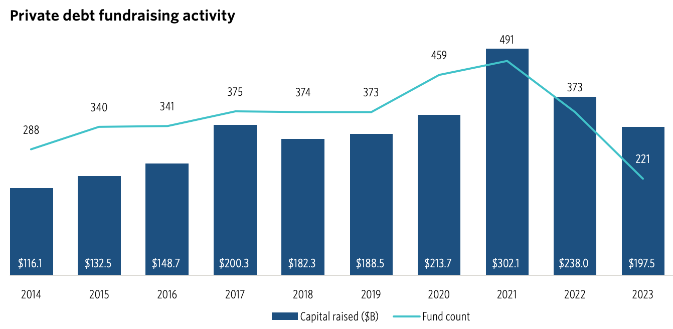 Alternative investment managers have capitalized on this trend. Particularly following the Covid pandemic, where private credit strategies raised 3 times more in 2021 than in 2014.Ā (Also See HPSā Massive fund in the fundraising section).