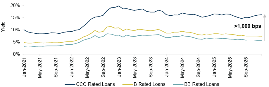 Weak credit documentation has heightened fears of poor recoveries, meaning struggling names can face immediate selling pressure. The data justifies this fear. While payment default rates remain low, recoveries are well below their long-term average: the recovery rate on first-lien loans stands at 37.7% versus the 25-year average of 62.3%.9