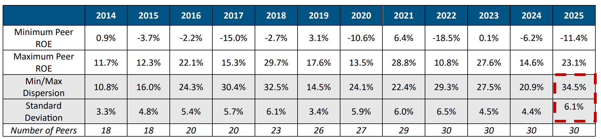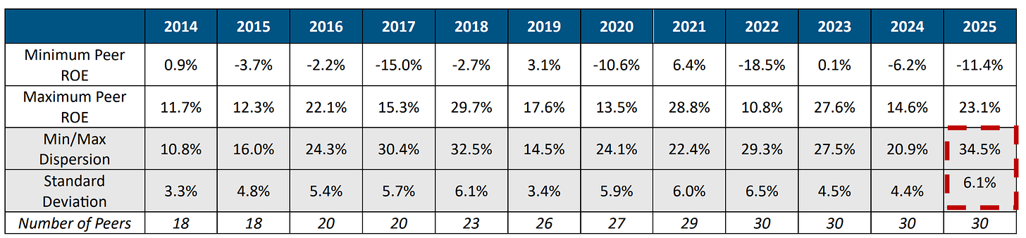 The dispersion between the minimum and maximum ROE is the widest we have seen.