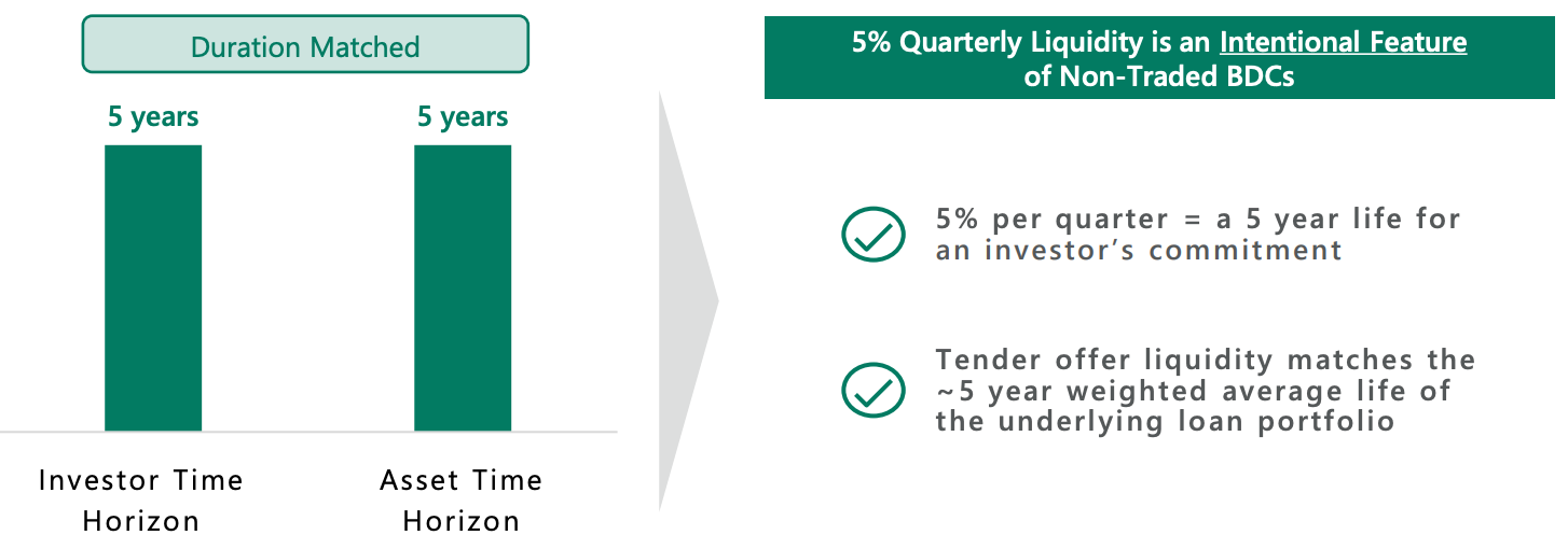 That is what we are now seeing in the non-traded BDC market. Utilizing liquidity for redemption activity (e.g., holding a liquidity sleeve in broadly syndicated loans) will, by definition, drive lower returns for non-traded vehicles; lower returns will result in increased capital flows to better relative return opportunities in other sectors of the market. We do not believe this environment will reverse in one quarter. If the non-traded REIT segment is any guide, this capital flow dynamic will last multiple years.