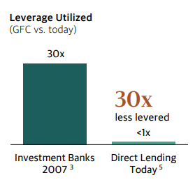 Business development companies typically operate with less than 1x leverage, lend at roughly 40% loan-to-value to corporate borrowers, and use structures that don’t rely on deposits or overnight capital.