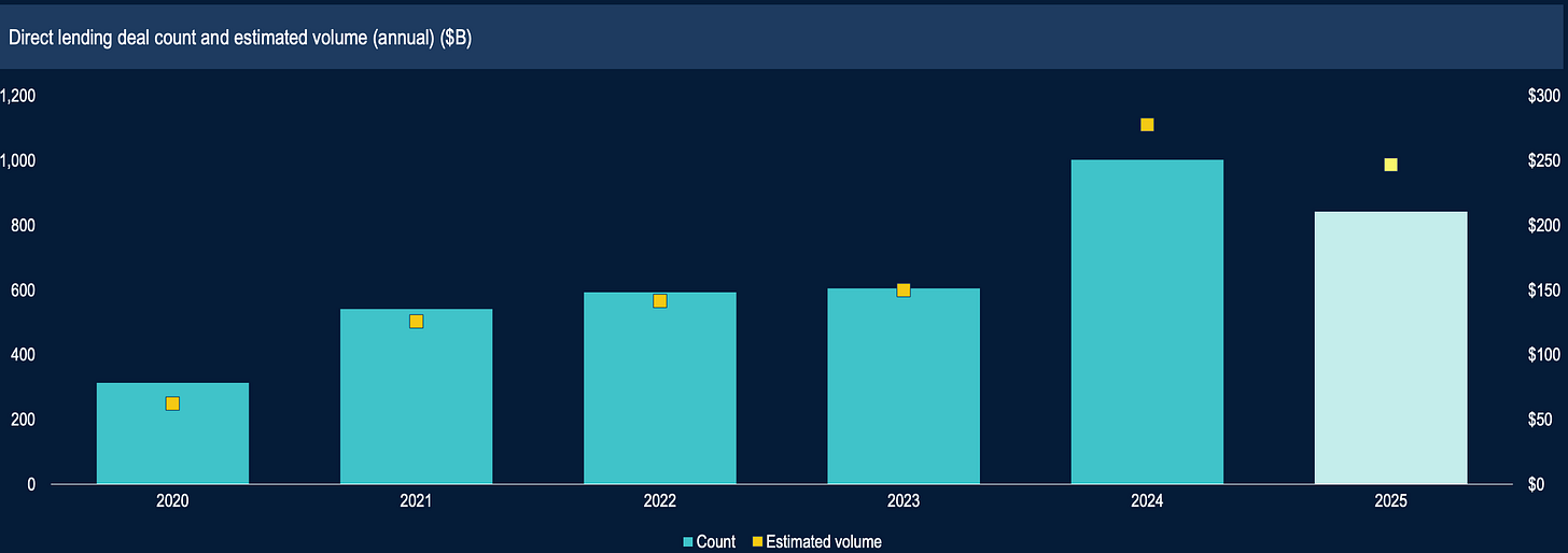 Despite the drop in lending in 2025 vs 2024, volumes remained historically strong. 2025 ranked as the second-busiest year for direct lenders in at least eight years.
