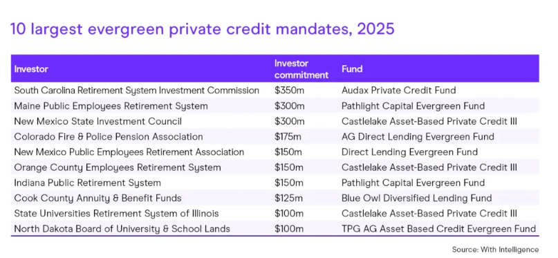 With Intelligence tracked over 40 commitments to evergreen funds from institutional allocators, totaling over $3 billion. The 10 largest mandates accounted for $1.9 billion.