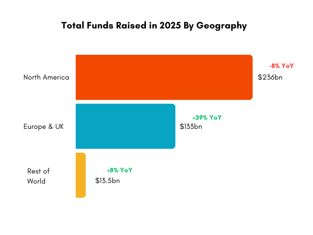 Fundraising in Europe and the UK was the standout for 2025, growing nearly 40% YoY.