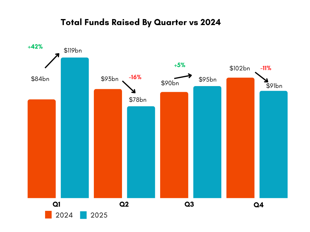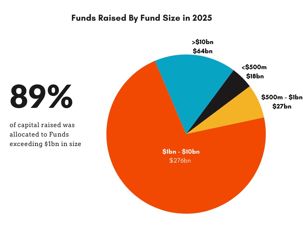 Only four funds raised more than $10 billion, half the number raised in 2024.